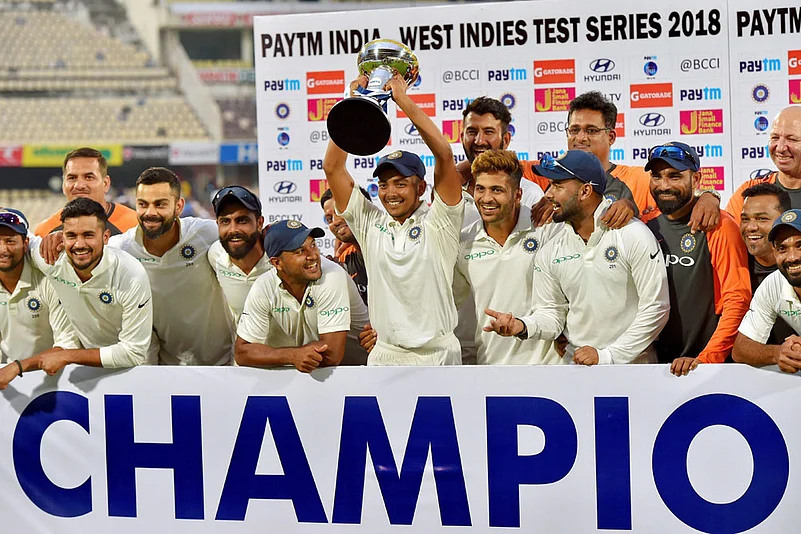 Team India poses with the trophy after beating the West Indies in the second cricket Test match in Hyderabad on October 14, 2018. PTI Photo/Kamal Kishore