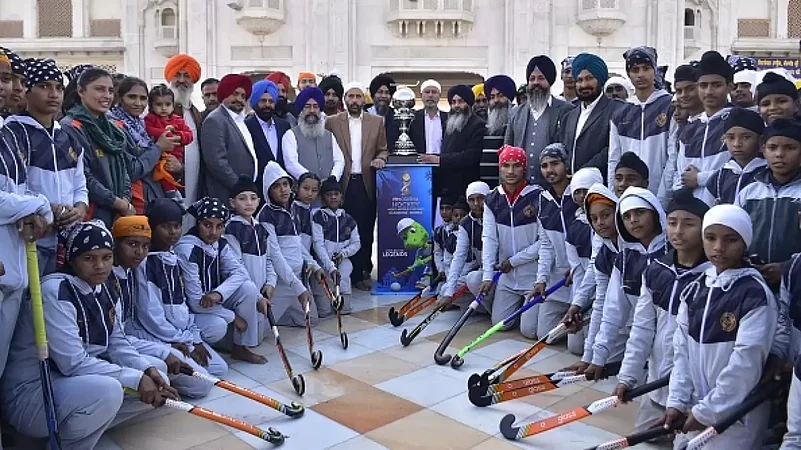 1- Shiromani Gurdwara Parbandhak Committee (SGPC) officials, SGPC Hockey players and Hockey officials with the FIH Hockey World Cup during Trophy Tour outside the Golden Temple on December 14, 2022 in Amritsar. Men's FIH Hockey World Cup will be held at the Kalinga Stadium in Bhubaneswar, India from 13 to 29 January 2023.