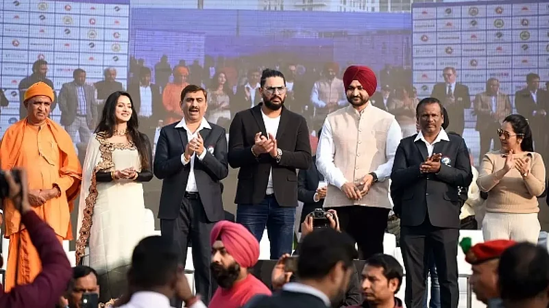 5- Yuvraj Singh, Former Indian cricketer, Sandeep Singh, Former caption of the Indian Hockey team, and Mahantesh GK, President of DCCII during the inauguration ceremony of 3rd T20 World Cricket Cup for the blind in Tau Devi Lal Stadium at sector-38 near Rajiv Chowk, on December 5, 2022 in Gurugram.