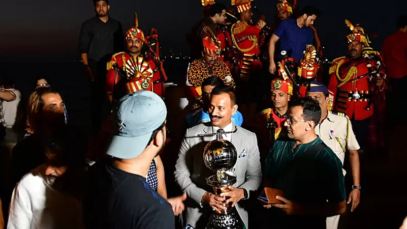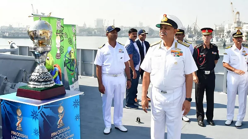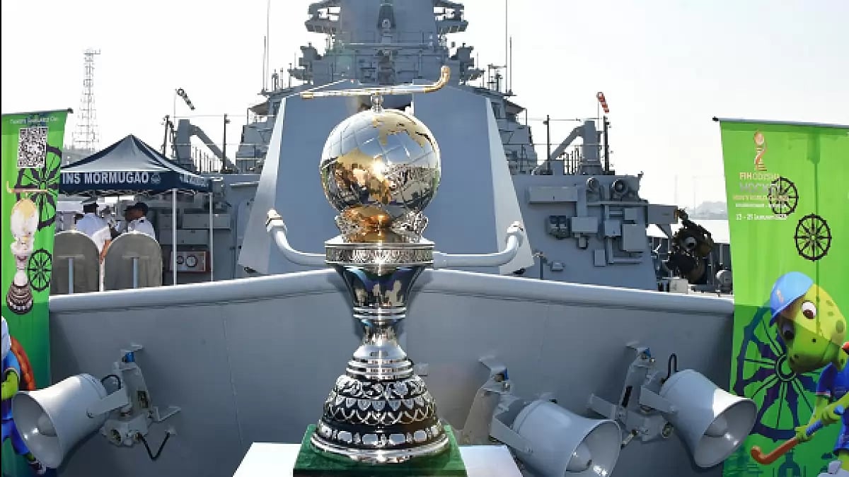 6- The FIH Hockey Men's World Cup 2023 trophy displayed onboard INS Mormugao in the presence of WNC Ajendra B. Singh, Indian Navy, and Indian hockey legend Arjuna Awardee and Olympic Gold Medallist M.M. Somaiya along with Navy School children, at Naval Dockyard, on December 20, 2022 in Mumbai.