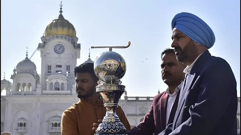 2- Hockey officials with the FIH Hockey World Cup during Trophy Tour outside the Golden Temple on December 14, 2022 in Amritsar.