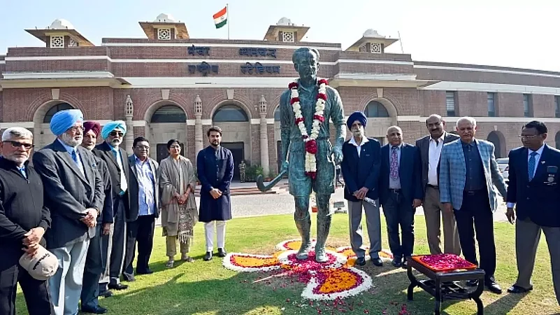 11- Union Sports Minister Anurag Thakur with hockey veterans unveiling the trophy of 2023 Men's FIH Hockey World Cup at Major Dhyan Chand National Stadium, on December 16, 2022, in New Delhi.