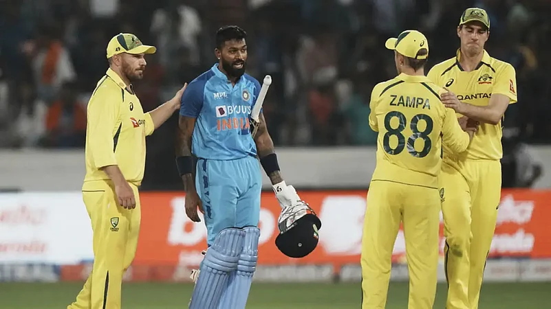 With Australia going over 13 runs per over, Axar provided the home side with the first breakthrough as he bowled a slower one, forcing Aaron Finch (7) to mistime the shot with Hardik collecting the ball at mid-on.