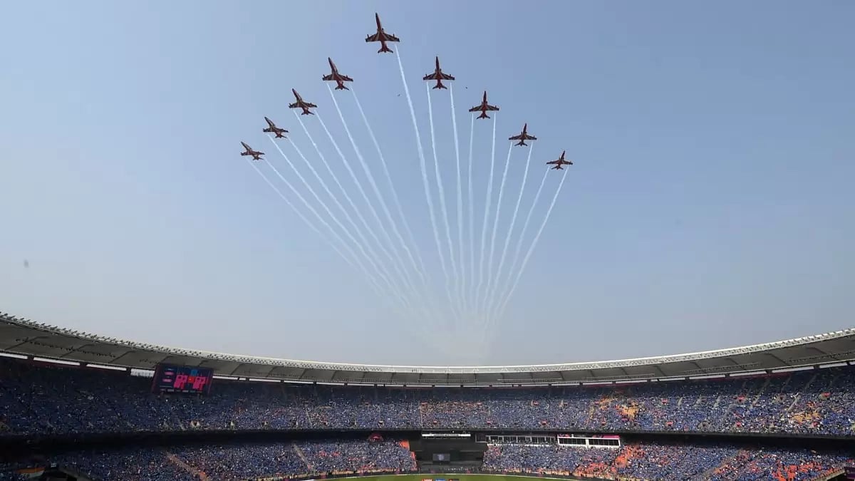 With the world's largest cricket stadium underneath packed to the brim by euphoric fans, the Surya Kiran Acrobatic Team of the Indian Air Force put up a spectacular show before the World Cup final between India and Australia on Sunday. (Match Blog | Streaming | Scorecard | Full Coverage)