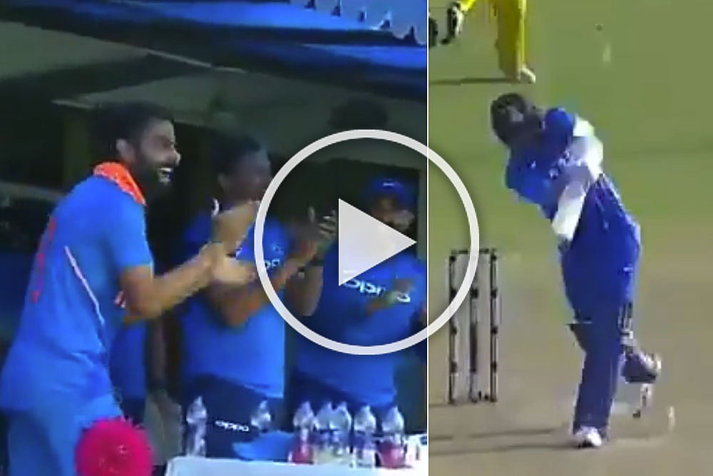 The unexpected six triggered wild celebrations in the Indian camp with skipper Virat Kohli leading the chorus. Watch it here: