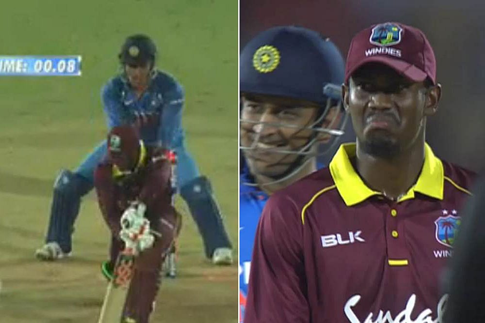 In the 28th over of the Windies's chase, Keemo Paul witnessed Dhoni's brilliance first hand. Paul, on his front foot, tried to play a defensive shot against Ravindra Jadeja's turning delivery. But the ball beat the bat and to his shock, the bails had already been dislodged when he regained position from the stretch. Look at his reaction.