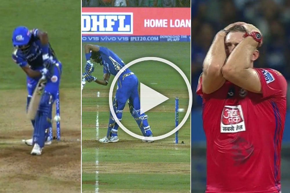 Hardik Pandya missed the first ball of the 13th over. But Hardus Viljoen's delivery hit the leg stump, and it beat wicketkeeper KL Rahul too. Strangely, the umpire declared it five wides. Forget the wicket, how can that be a wide?