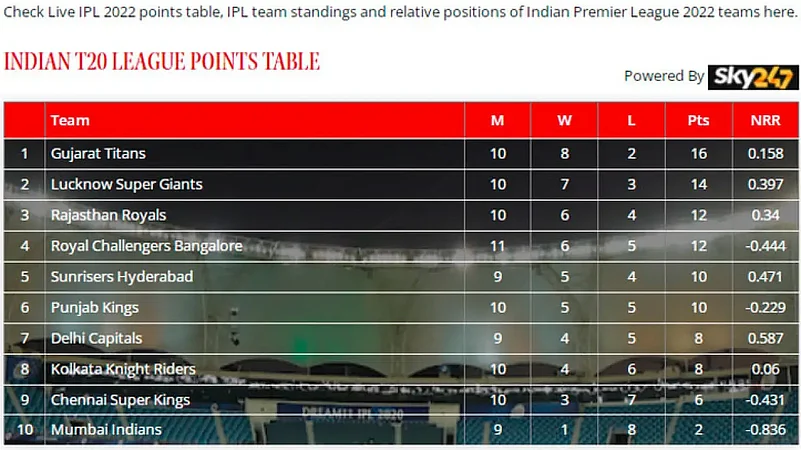 Their fellow debutants Lucknow Super Giants are second with 14 points from ten outings, while Rajasthan Royals and Royal Challengers Bangalore have 12 each from 10 and 11 matches respectively.