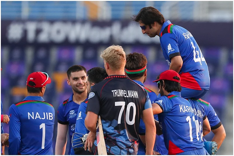 Afghanistan gave a fitting farewell to their former captain Asghar Afghan after defeating Namibia by 62 runs in the Super-12 T20 World Cup match at Abu Dhabi on Sunday. The team's current skipper Mohammad Nabi and wicketkeeper-batter Mohammad Shahzad lifted Afghanistan to post a competitive total of 160 for the loss of five wickets before Naveen-ul-Haq and Hamid Hassan picked up three wickets each to restrict Namibia to 98/9 in a one-sided contest. Namibia batters struggled to read the slower balls delivered by Afghanistan bowlers. Half of their side was back in the dugout by the half of the proceedings. Although David Wiese and Ruben Trumpelmann displayed some intent but could not build on it in front of top-class Afghanistan bowlers.