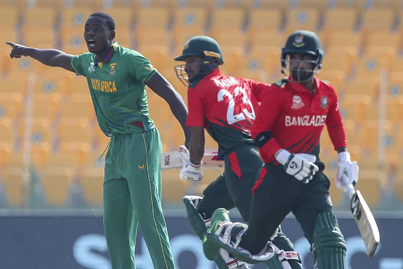 South Africa hammered Bangladesh by six wickets with 39 balls to spare in their Super 12 match of the ICC Men's T20 World Cup 2021 match in Abu Dhabi, UAE on Tuesday. The win, third in four outings, kept Temba Bavuma & Co in contention for a semi-final place. The Proteas are now second in Group 1 behind pace-setters England, who have won their four matches so far. Australia, with two wins in three, are third. Bangladesh are out of the tournament. Bavuma won the toss and opted to bowl first. And his pacers set the stage on fire with Kagiso Rabada (3/20) and Anrich Nortje (3/8) taking three wickets each. Mahedi Hasan (27 off 25) top-scored for the Tigers. Chasing a paltry target of 85, South Africa lost Reeza Hendricks in the first over to Taskin Ahmed, then Quinton de Kock to Mahedi Hasan. Bangladesh, giving their best, got another, with Taskin removing Aiden Markram for a duck. But Bavuma played a measured knock of 31 off 28 to take the Proteas home in 13.3 overs. South Africa take on England in their final group match in Sharjah on November 6. Winless Bangladesh play their final match on November 4, against Australia in Dubai. Catch highlights of South Africa vs Bangladesh here: