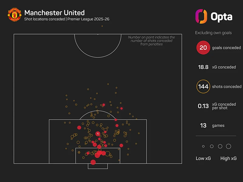 That is United's only shutout in 2025-26 so far, though, and they have conceded 20 goals in 13 matches from 18.8 expected goals against (xGA).