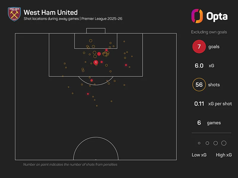 Their total shots (56) are also down on their travels (71 at home), with just 20 of those testing the opposition goalkeeper. Only four West Ham players have had more than one shot on target, with Callum Wilson responsible for seven.