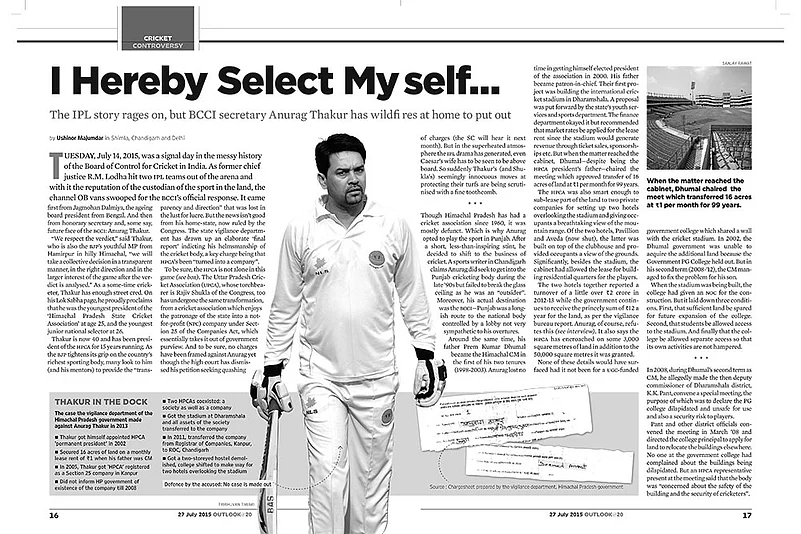 At the time, HPCA didn’t do much other than vote at the BCCI annual general meeting. Thakur managed to get a stadium built at pristine Dharamsala and other local work for cricket but his method and motives have been challenged in a vigilance probe, which Outlook reported last year. Thakur hotly denied all allegations. He even took a leaf out of BCCI vice-president Rajiv Shukla’s UPCA book and converted HPCA from a society to a not-for-profit company.