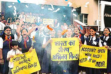 Pan-Indian paens: Schoolchildren in Ahmedabad celebrate Bindra's achievement