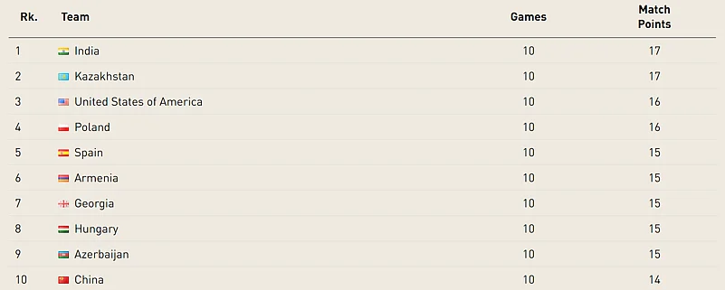 The Indian women are tied at 17 points with Kazakhstan after 10 rounds and will face Azerbaijan in the 11th and final round. Kazakhstan will take on the United States, meanwhile. For India to bag gold, they need to win their match and also hope for Kazakhstan to either lose or draw their match against the USA. In case India win and Kazakhstan win too, it will come down to a tie-breaker. You can learn more about the tie-break rules here.