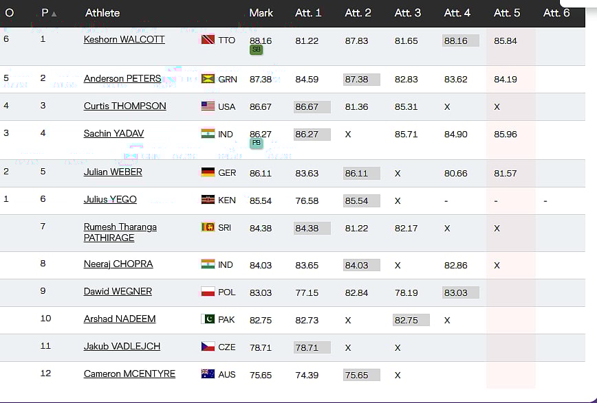 Sachin Yadav lands a solid 84.90m on his fourth attempt, keeping his podium hopes alive with two throws still to come. Julian Weber tries to respond but can’t quite find the mark, his javelin landing at 80.66m and leaving him in fifth place.