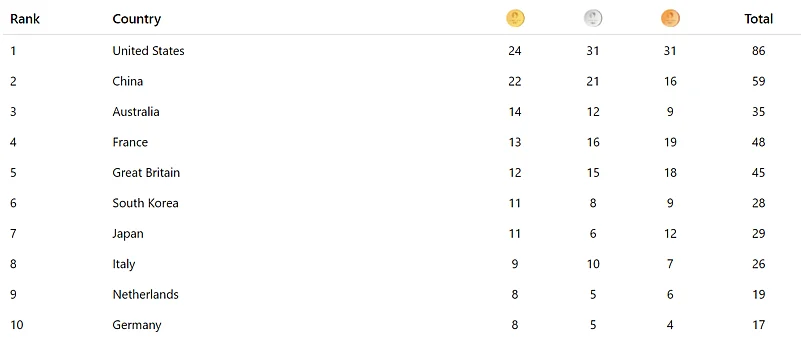 United States jump to first place with 24 gold medals, while China are second with 22.