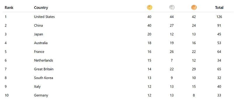 The United States and China ended with 40 gold medals each, but the US first on top with 126 medals with respect to China's 91.