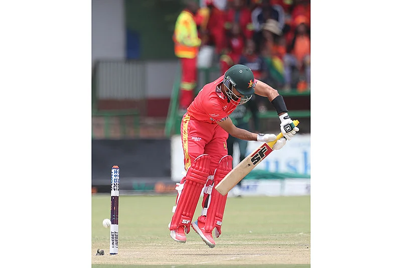 Zimbabwe's Richard Ngarava plays a ball on the first day of the ODI cricket match between Zimbabwe and Pakistan at Queens Sports Club in Bulawayo, Zimbabwe.