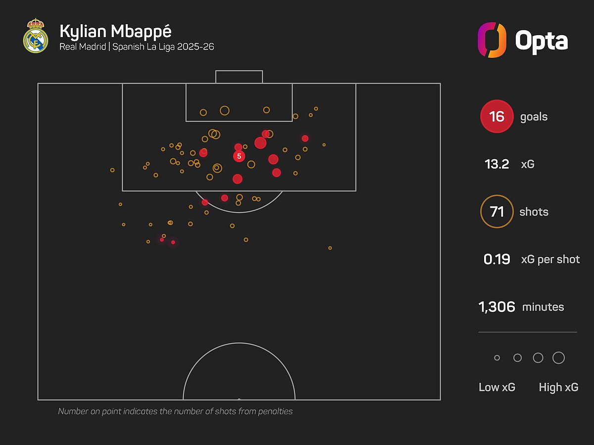 Mbappe has netted 16 times in 15 games in LaLiga this season, with those goals coming from an expected goals (xG) figure of 13.2.
