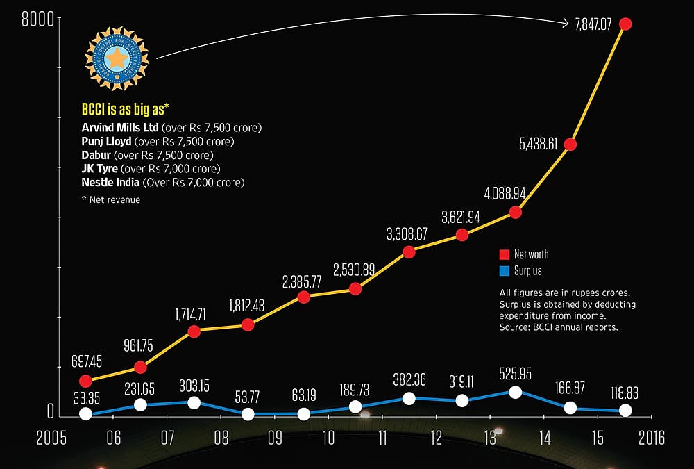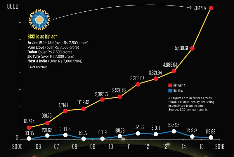 The BCCI, the wealthiest cricket body in the world, reached another milestone in 2016-17 when it broke the Rs 7,000-crore barrier. Its net worth, as on March 31, 2016, was Rs 7,847.07 crore—over 191 times what it was 20 years ago. In 1995-96, BCCI was worth Rs 41.03 crore and made a surplus of Rs 23.50 crore. Just before the 1993 home series against England, then BCCI president I.S. Bindra and secretary Jagmohan Dalmiya sold the telecast rights for the home England series to TWI for $6,00,000 a match. Earlier, it used to pay Doordarshan to have the matches telecast. It has not looked back since.