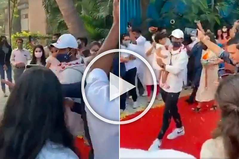 Rahane was welcomed with the beats of dhol, while others showered the cricketer with flower petals.