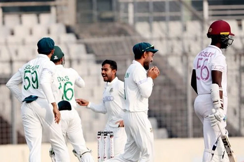 Offspinner Mehidy Hasan then spun one sharply to remove Shayne Moseley (7) for his 100th Test wicket. Left-arm spinner Taijul Islam grabbed the wicket of John Campbell, who scored 18 off 48.
