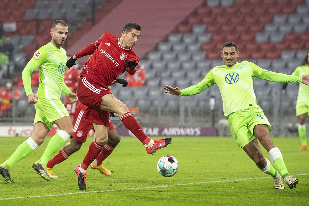 Robert Lewandowski scored his 250th Bundesliga goal as Bayern Munich came from behind to beat Wolfsburg 2-1 and keep the pressure on Bayer Leverkusen. (More Football News)