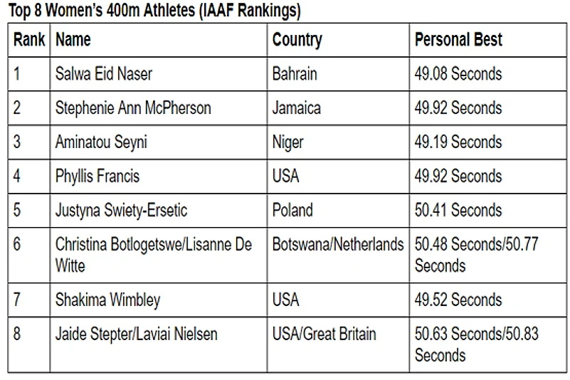 In 200 metres, the current world no.1 is Bahrain's Shaunae Miller-Uibo and the world no.8 is Gabrielle Thomas of the United States. The former’s personal best timing is 21.88, the latter’s is 22.19 seconds. Hima’s best timing in this event is 23.10.