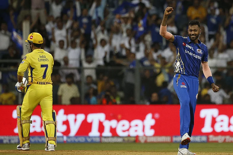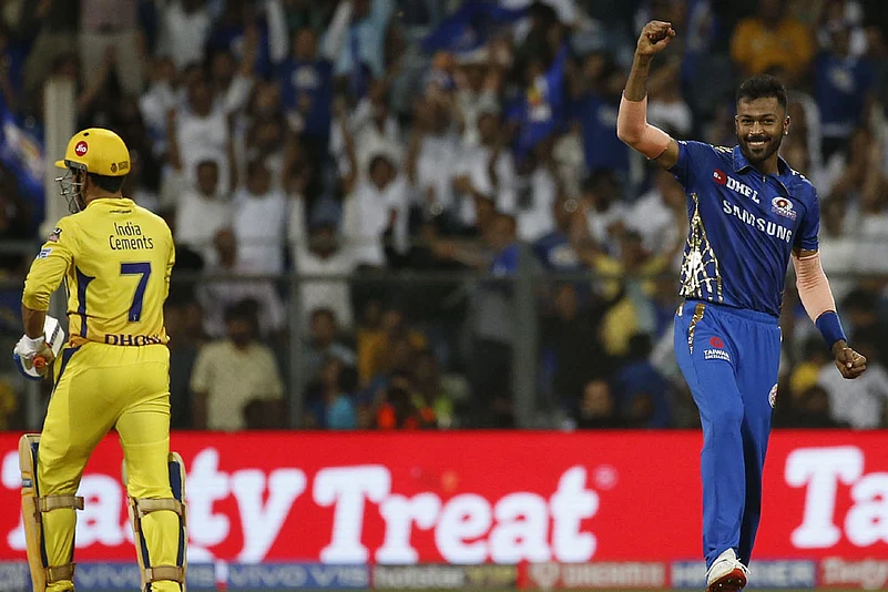 Mumbai Indians' Hardik Pandya, right, celebrates the dismissal of Chennai Super Kings' Mahendra Singh Dhoni, left, during the VIVO IPL T20 cricket match between Mumbai Indians and Chennai Super Kings in Mumbai, India, Wednesday, April 3, 2019. (AP Photo/Rafiq Maqbool)
