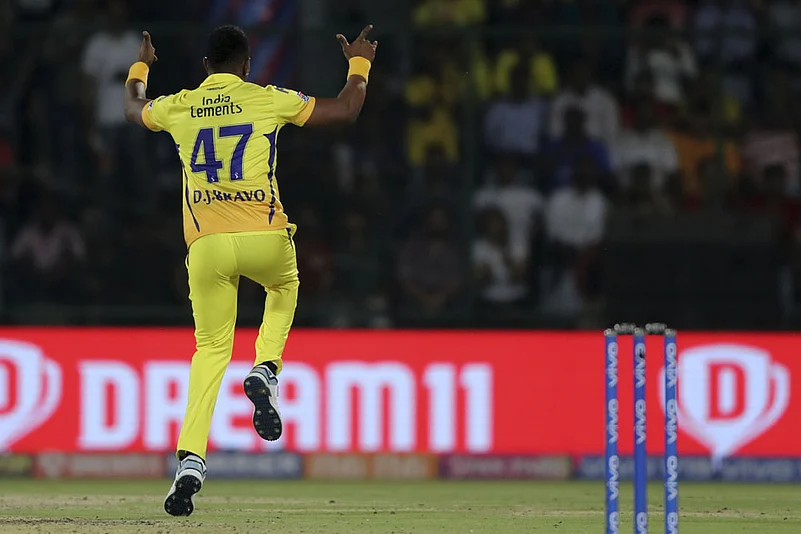 Chennai Super Kings' Dwayne Bravo celebrates fall of a wicket in an IPL match. (AP Photo/Altaf Qadri)