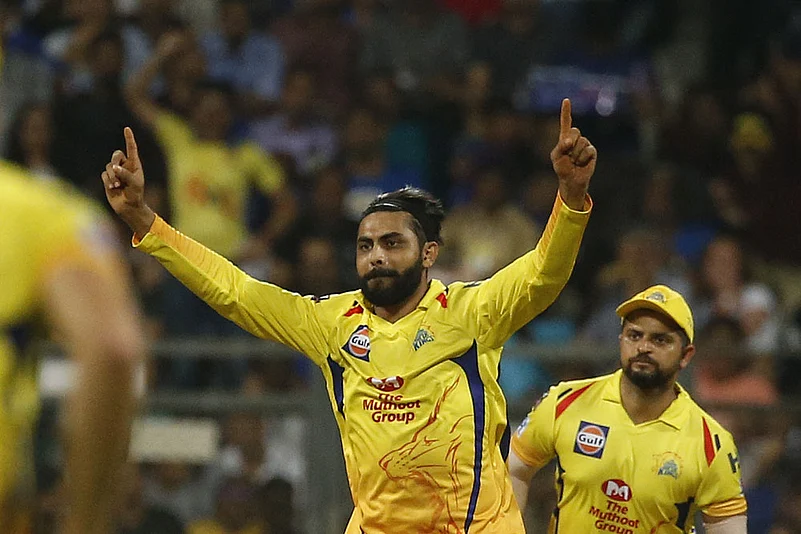 Chennai Super Kings' Ravindra Jadeja celebrates the dismissal of Mumbai Indians' Rohit Sharma during the VIVO IPL T20 cricket match between Mumbai Indians and Chennai Super Kings in Mumbai, India, Wednesday, April 3, 2019. (AP Photo/Rafiq Maqbool)