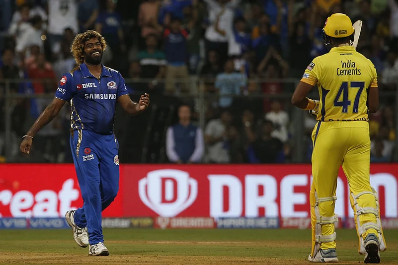 Mumbai Indians' Lasith Malinga, left, celebrates the dismissal of Chennai Super Kings' Dwayne Bravo, right, during the VIVO IPL T20 cricket match between Mumbai Indians and Chennai Super Kings in Mumbai, India, Wednesday, April 3, 2019. (AP Photo/Rafiq Maqbool)