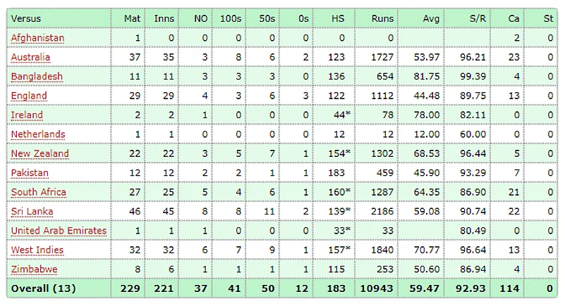 In total, he registered 459 ODI runs against them, in an average of 45.90, followed by a strike-rate of 93.29.