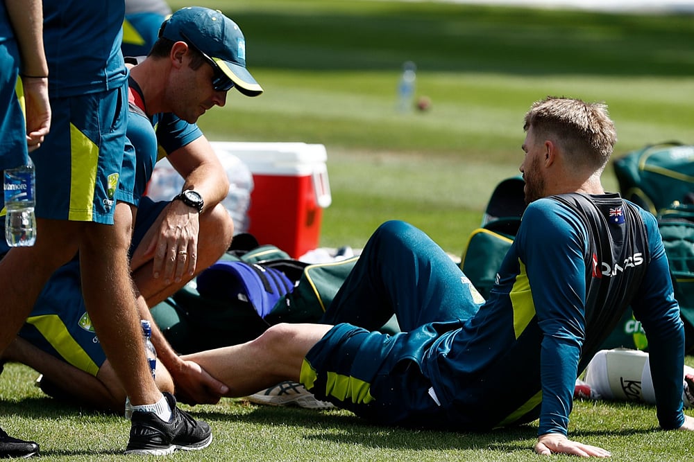 The tourists were preparing on the Edgbaston pitch before the first Test against England, which starts on Thursday, when Warner inside-edged a ball from Michael Neser into his left thigh.