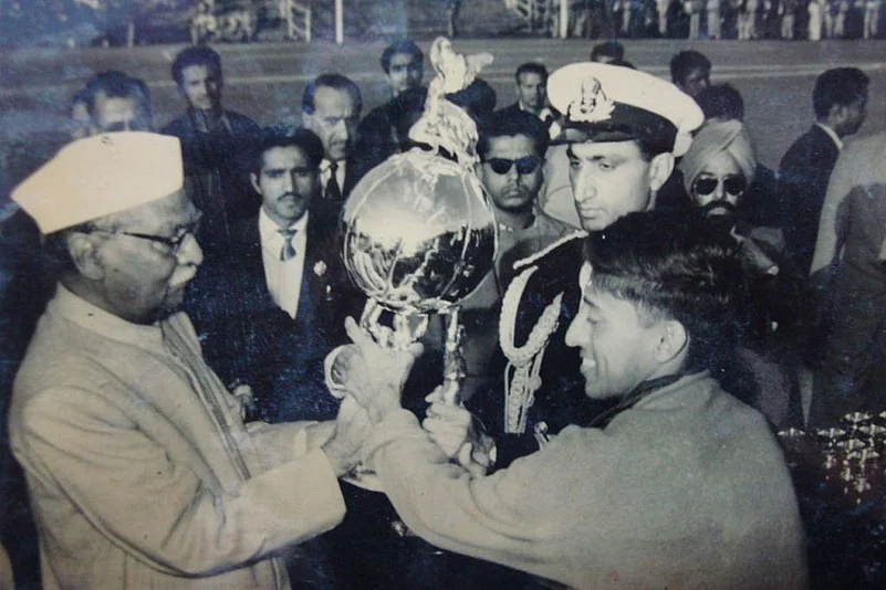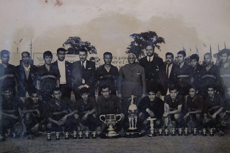 Field Marshal Sam Manekshaw (Standing 5th from Left) & President V.V.Giri (Standing center) with the winners after a Durand Final. File photo