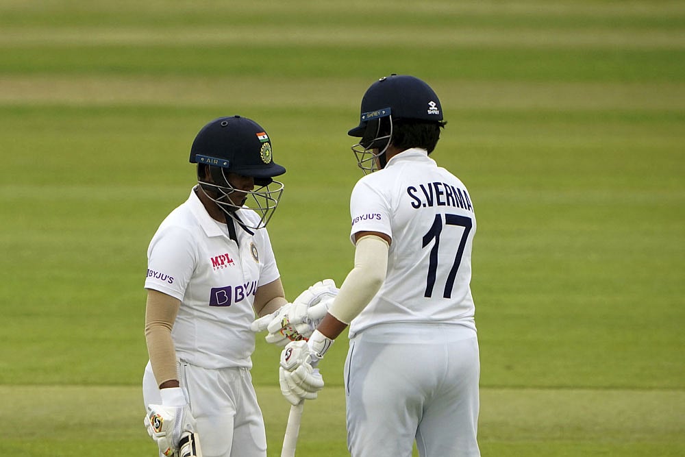 A sensational unbeaten 104-run ninth-wicket stand between Sneh Rana and Taniya Bhatia forced England Women to shake hands on Day 4 of their one-off Test as India Women snatched a draw from the jaws defeat at County Ground, Bristol Saturday. But the 'hero' of the match was 17-year-old Shafali Verma, who hit 96 runs in the first innings and 63 in the second essay. The young opener was deservedly declared the player of the match. Well, Rana was also India's bowling star. She claimed four wickets. England won the toss and opted to bat first on the used pitched, for which England cricket board got the rebuke. But the hosts, riding on skipper Heather Knick's 95 and fifties from Tammy Beaumont and Sophia Dunkley post 396/ 9 before the declaration. India were then dismissed for 231 despite a 167-run opening stand with Smriti Mandhana scoring 78. Sophie Ecclestone claimed four Indian wickets. Then, following-on, India reached 344/8. Catch highlights and cricket scores here:
