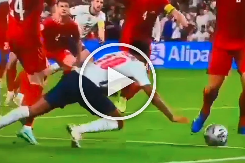 Raheem Sterling burst into the penalty area in extra time of the semifinal match against Denmark and appeared to lose his balance following a challenge by Joakim Maehle. The England winger eventually fell to the ground after a nudge from another Denmark player, Mathias Jensen.