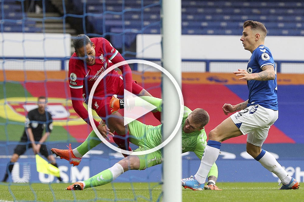 Barely three minutes later, Fabinho looped the ball into the Everton penalty area towards Van Dijk and Pickford lunged into the centre-back, missing the ball.