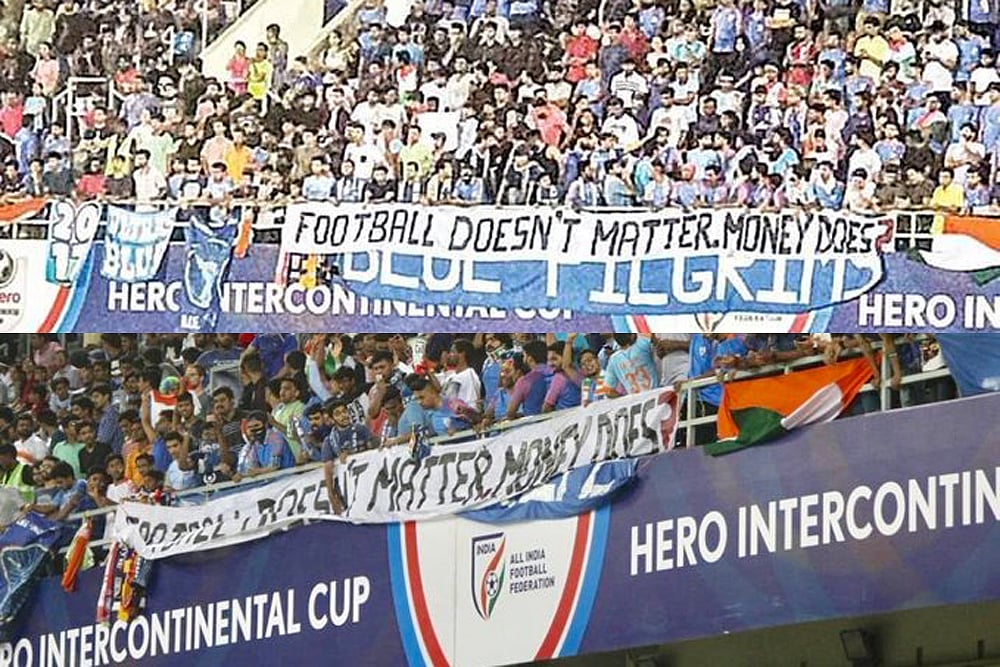 During the Intercontinental Cup match against North Korea in Ahmedabad on July 13, the Blue Pilgrims held massive banners saying 'Football Doesn't Matter, Money Does'. This was in protest against the AIFF's plan to give the ISL, a product promoted by the Football Sports Development Limited, a premier position ahead of the popular I-League, played by the 10 top regional clubs of India. After officials asked the fans to not carry such banners, they wore shirts which protested against the latest developments in Indian football.