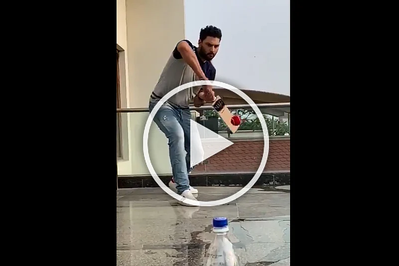 In a video posted on his Twitter account, Yuvi is seen playing cricket with a red tennis ball, in a balcony. He attempts a drive at the ball, towards the bottle. It knocks the cap out, and also forces the bottle down.