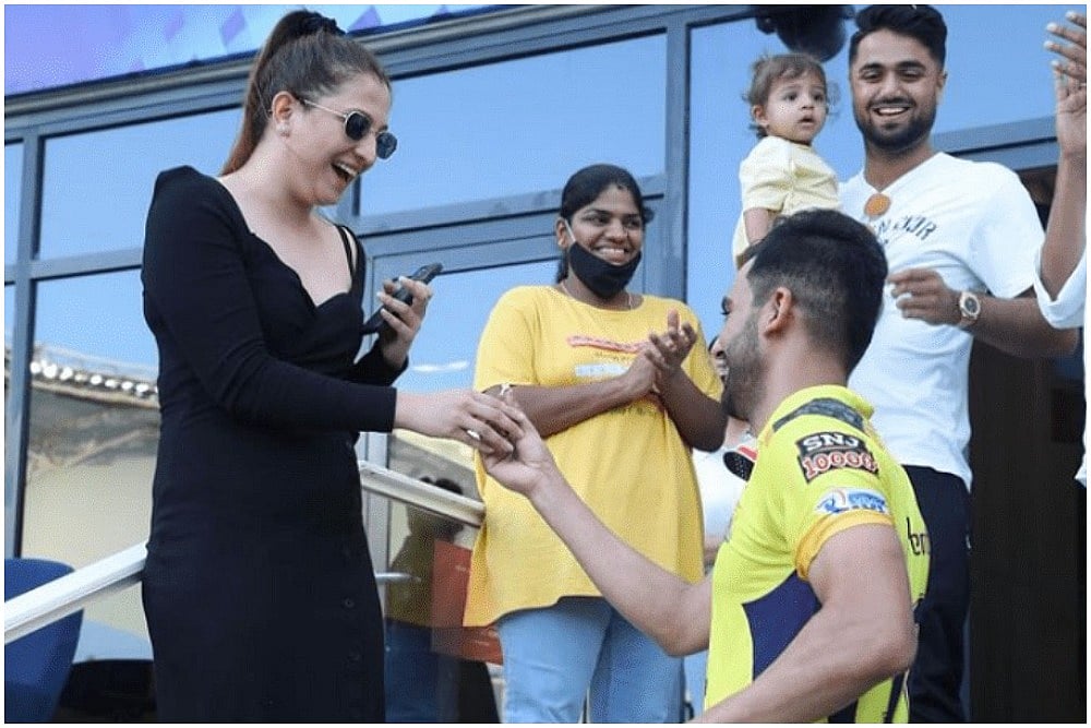 After CSK lost against Punjab Kings in an IPL 2021 encounter on Thursday, Deepak Chahar took everyone present at the stadium by surprise when he took out a ring from his pocket and went down on his knees to propose to girlfriend Jaya Bhardwaj at the VIP pavilion.