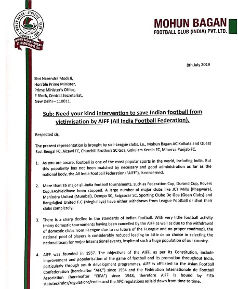 In a letter signed by Swapan Sadhan Bose, managing director of Mohun Bagan, the I-League clubs have urged the prime minister to "intervene and save the sport".