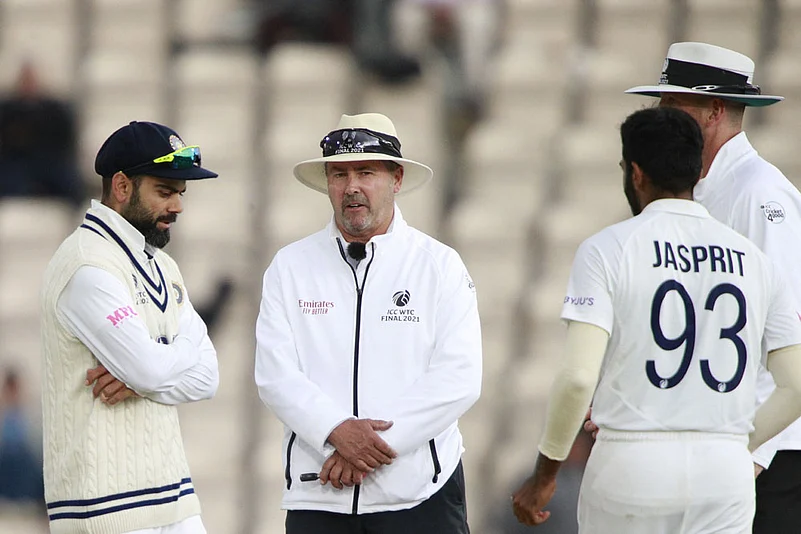 Boult and Jamieson kept bowling outside the off-stump channel and Kohli kept on leaving before the lanky seamer went slightly wide off the crease and got one to aim at rival skipper's boot laces.