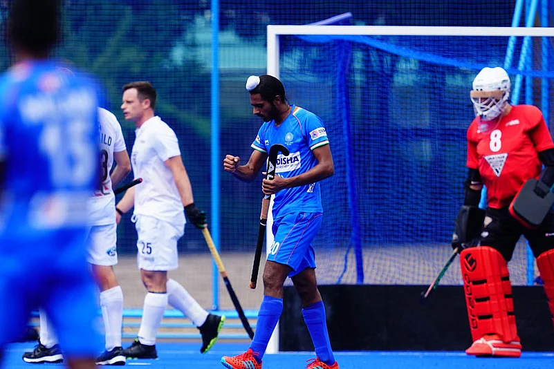 Captain Harmanpreet Singh (7th minute) set the ball rolling before Shamsher Singh (18th minute), Nilakanta Sharma (22nd minute), Gursahibjit Singh (26th minute) and Mandeep Singh (27th minute) scored for India at the Oi Hockey Stadium here.