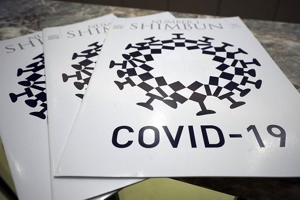 The design combines the distinctive, spiky image of the coronavirus cell with the blue-and-white Tokyo 2020 logo, and appeared on the front page of an in-house magazine published by the Foreign Correspondents' Club of Japan (FCCJ).