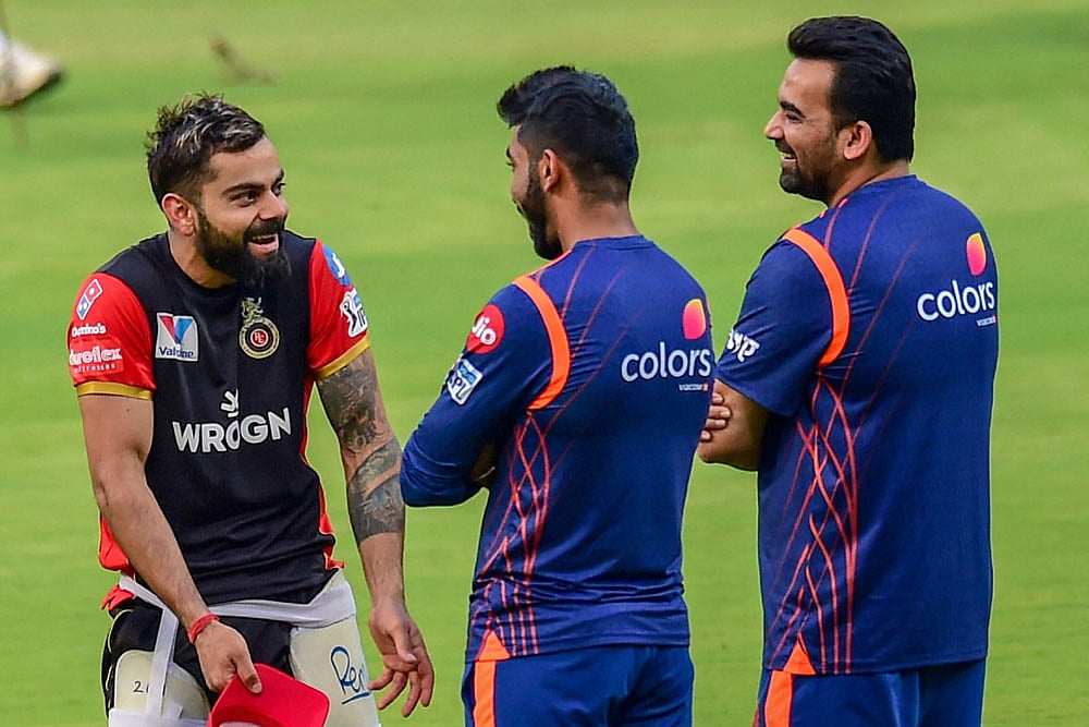 RCB Skipper Virat Kohli share a light moment with MI player Jasprit Bumrah and mentor Zaheer Khan during a practice session, ahead of the Indian Premier League 2019 (IPL T20) cricket match between Royal Challengers Bangalore (RCB) and Mumbai Indians (MI) at Chinnaswamy Stadium, in Bengaluru, Tuesday, March 26, 2019. PTI Photo