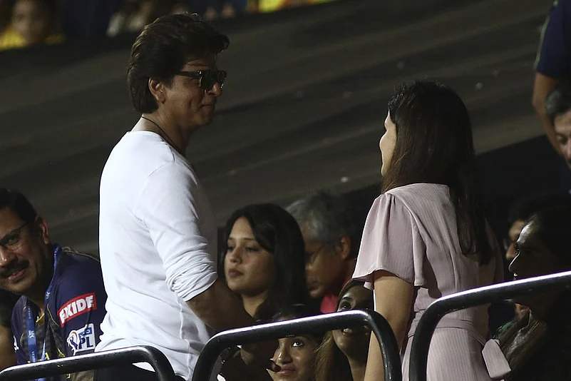 Shah Rukh Khan talks to Shakshi Dhoni during Chennai Super Kings vs Kolkata Knight Riders IPL match in Chennai. AP Photo