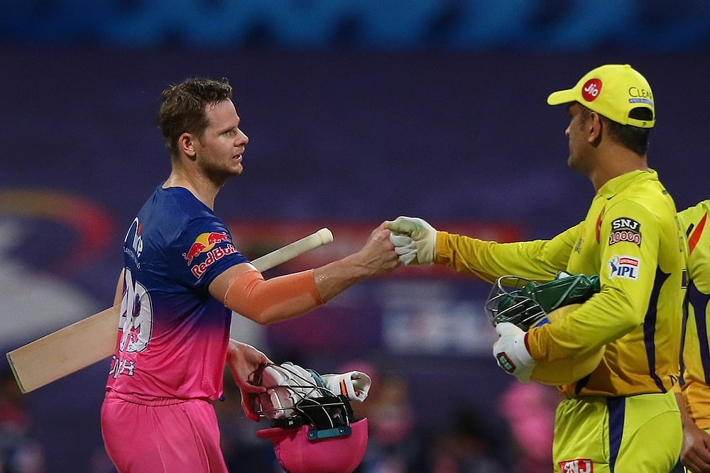 MS Dhoni and Steve Smith after Rajasthan Royals beat Chennai Super Kings in Abu Dhabi on Monday. Photo: BCCI