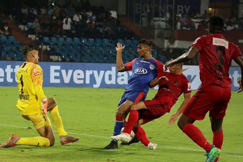 Holders Bengaluru FC began their title defence with a goalless draw against a spirited NorthEast United FC in the Indian Super League (ISL) at Bengaluru on Monday.